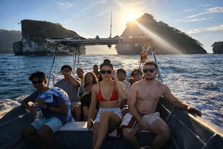 You will meet your host in the late afternoon in Zona Romántica, where the group will be welcomed and given a short introduction. From there, you will travel together to the coastal village of Mismaloya. Upon arrival, you will receive a welcome drink to set the tone for the evening. As the sun begins to set, you will spend time on the water during golden hour and watch the sunset over the Pacific from the bay. This part of the experience is relaxed, with time to enjoy the views or take photos as daylight fades. After nightfall, you will continue to the Los Arcos rock formations, a protected marine area known for its natural bioluminescence. In low-light conditions, movement in the water creates a blue glow caused by microscopic organisms. In sheltered areas near the rock formations, the bioluminescence becomes more visible. If you choose, you may enter the water for a swim to experience the bioluminescence up close, while others may observe from the the boat. Swimming is always optional, and the focus remains on a calm and respectful interaction with the environment. The experience takes place in a small group, allowing for a quieter and more personal atmosphere. After spending time observing and, if desired, swimming in the bioluminescent water, we will return by boat to the meeting point area.